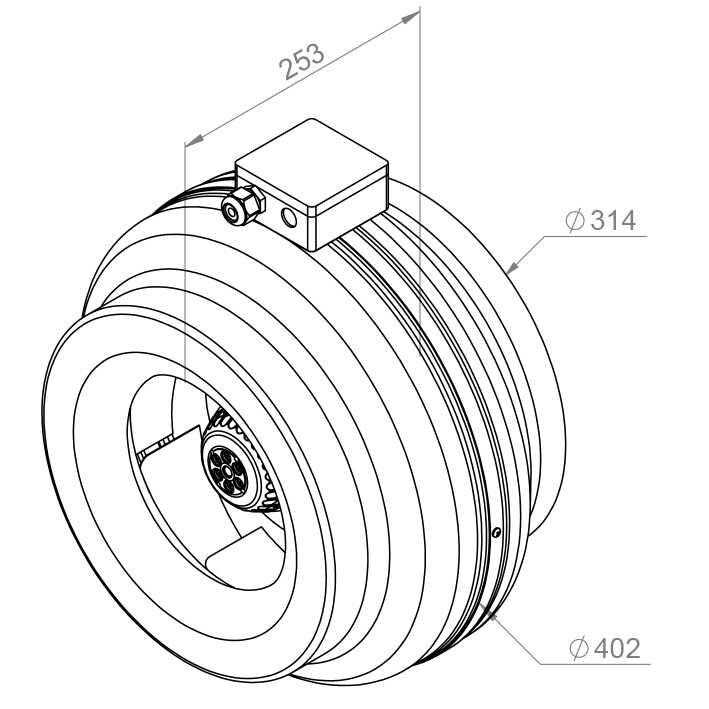 Fan, açık gri renkte toz kaplamalı metal bir mahfazaya (RAL 7035) sahiptir. Kapalı harici rotorlu motor, dahili termal temas ile aşırı ısınmaya karşı korunmaktadır. Pervane, DIN/ISO 1940 kalite sınıfı G 6.3'e göre motorla dengelenmiştir.