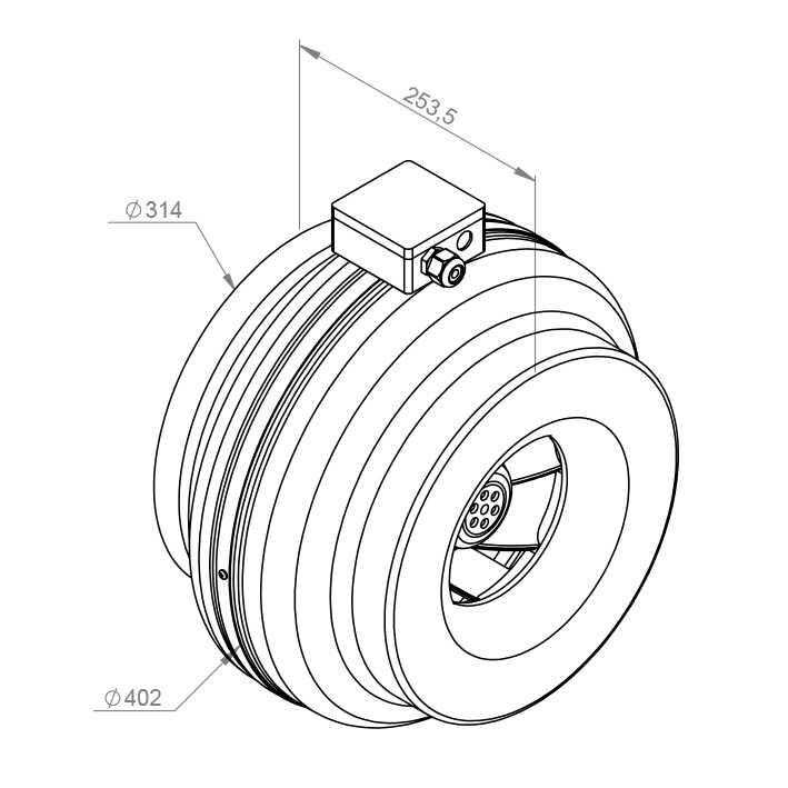 Fan, açık gri renkte toz kaplamalı metal bir mahfazaya (RAL 7035) sahiptir. Kapalı harici rotorlu motor, dahili termal temas ile aşırı ısınmaya karşı korunmaktadır. Pervane, DIN/ISO 1940 kalite sınıfı G 6.3'e göre motorla dengelenmiştir.