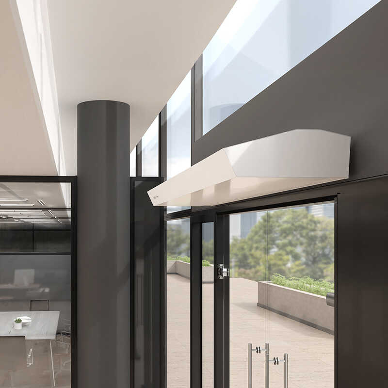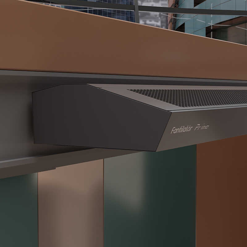 PRIME DOOR hava perdeleri, etkin tasarım metotlarının kullanılması ve yenilikçi ürün tasarımının getirdiği avantaj sayesinde 17 cm gibi ince bir cihaz yüksekliğine ve etkileyici bir tasarıma sahiptir. PRIME DOOR serisi hava perdesinin emiş menfezi, ürünün modern tasarımı ile cihazın üst kısmında konumlandırılmıştır.